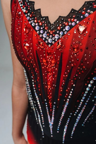 Роскошный и выразительный купальник «История королевы» создан для программ с сильным характером и яркой подачей. Контрастное сочетание глубокого чёрного и насыщенного алого оттенков формирует эффект драматичного перехода цвета, а вытянутый центральный рисунок визуально стройнит и усиливает вертикаль силуэта.