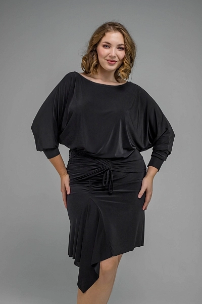 Блуза Lazio — изысканная модель с выразительной игрой фактур, созданная так, чтобы особенно красиво смотреться и в больших размерах. Основная часть выполнена из мягкого масла, которое плавно облегает фигуру, визуально вытягивает силуэт и не подчёркивает объёмы. Воздушные элементы из сетки формируют эффектные накидные рукава, добавляя лёгкость и движение, при этом деликатно прикрывая зону рук — важный акцент для plus size. Глубокий, но элегантный вырез на спине открывает ровно столько, сколько нужно для сценического эффекта, не нарушая комфорта. Продуманная драпировка в области корпуса помогает скорректировать линии талии и создаёт мягкий, женственный силуэт. Модель отлично держится в танце и выглядит дорого как в движении, так и в паузах.