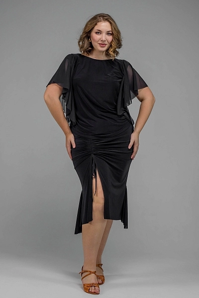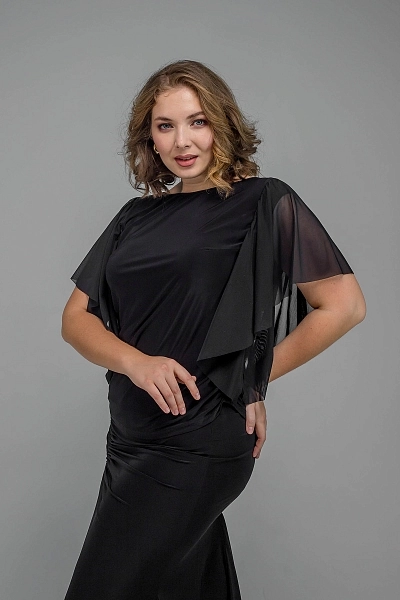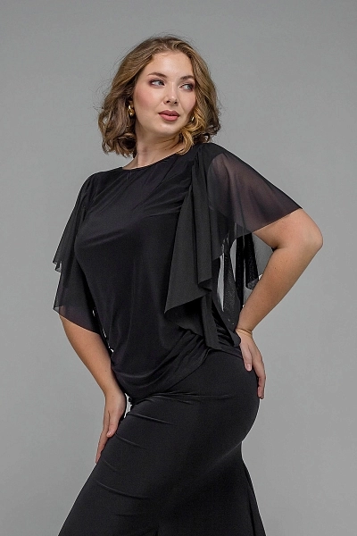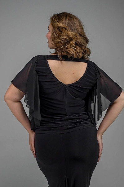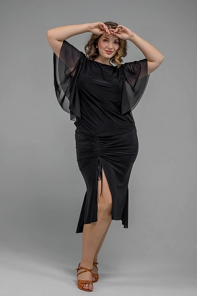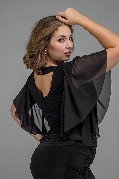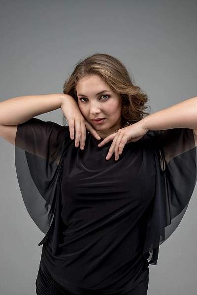 Блуза Lazio — изысканная модель с выразительной игрой фактур, созданная так, чтобы особенно красиво смотреться и в больших размерах. Основная часть выполнена из мягкого масла, которое плавно облегает фигуру, визуально вытягивает силуэт и не подчёркивает объёмы. Воздушные элементы из сетки формируют эффектные накидные рукава, добавляя лёгкость и движение, при этом деликатно прикрывая зону рук — важный акцент для plus size. Глубокий, но элегантный вырез на спине открывает ровно столько, сколько нужно для сценического эффекта, не нарушая комфорта. Продуманная драпировка в области корпуса помогает скорректировать линии талии и создаёт мягкий, женственный силуэт. Модель отлично держится в танце и выглядит дорого как в движении, так и в паузах.