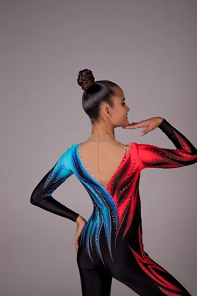 Для юных чемпионок, стремящихся к победе, и для профессиональных гимнасток, для которых каждый выход — это искусство, рождается комбинезон «Джокер». Он создан из качественного черного бифлекса с благородным блеском, а его крой украшают выразительные рельефные настрочки. Эти фактурные линии, идущие по бокам, не только идеально облегают фигуру, но и служат контуром для дизайнерской росписи: со стороны оранжевого огня и ледяной синевы, символизируя двойственность яркого образа.