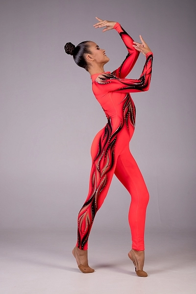Главной особенностью модели стали волнообразные настрочки из черного бифлекса, которые украшают верхнюю часть и одну из штанин. Ручная роспись аэрографом черного цвета создает эффект легкой дымки, словно продолжение линий, добавляя образу динамики и загадочности. «Храброе сердце» — для гимнасток, чьи выступления полны смелости и эмоций, а каждый элемент костюма подчеркивает силу и грацию своей обладательницы.