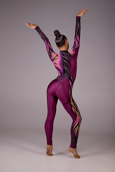 Для истинных ценителей элегантности, чье выступление — это высшее пилотажное искусство, создан комбинезон «Маэстро». Он выполнен из благородного темно-малинового бифлекса с утонченным блеском, а его дизайн построен на виртуозной игре иллюзий. Настрочки из итальянской телесной сетки, идущие по бокам ног и корпуса, создают эффект изящных открытых участков, придавая образу легкость и утонченность.