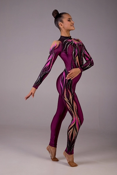 Центром композиции становятся художественные волны из бифлекса, украшающие боковую часть ноги и верх корпуса. Этот рельефный узор мастерски расписан аэрографией в розовых и бордовых тонах, создавая живописный градиент и ощущение динамичного движения даже в статике. Как и в лучших произведениях искусства, здесь каждая деталь совершенна: стойка и зона груди из сетки обеспечивают комфорт, а скрытая молния гарантирует безупречную посадку. «Маэстро» — это ваш дирижерский взмах, превращающий номер в незабываемый спектакль.