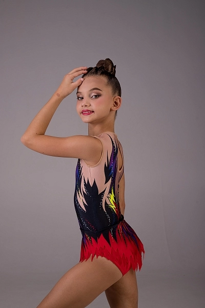 Купальник для художественной гимнастики «Вегас» выполнен из высококачественного сублимационного бифлекса, который обеспечивает отличную посадку и комфорт при любом движении. Дизайн основан на ярком динамичном узоре, напоминающем вспышки света и огненные языки, создавая эффект стремительной энергии. В палитре гармонично сочетаются насыщенные красные, фиолетовые, синие и чёрные оттенки с контрастными неоново-жёлтыми акцентами. Детальная прорисовка и плавные переходы подчёркивают выразительность композиции. Нюдовый верх усиливает впечатление, будто узоры «пылают» на теле гимнастки. Юбочка выполнена двойной — из бифлекса и лёгкой сетки, что придаёт объём, пластичность и дополнительную воздушность движений. Фигурный зубчатый край подчёркивает огненную тематику образа. Мелкие сияющие точки по всему купальнику добавляют сценического блеска. На спине предусмотрена застёжка-капелька для удобства и аккуратного оформления силуэта.