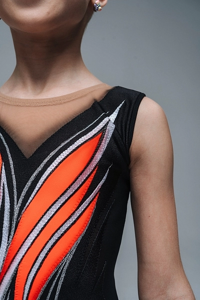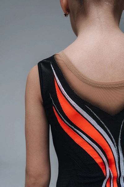 Легкая асимметричная юбочка из сетки добавляет образу воздушности и подчеркивает динамику движений, эффектно раскрываясь во время выступления.