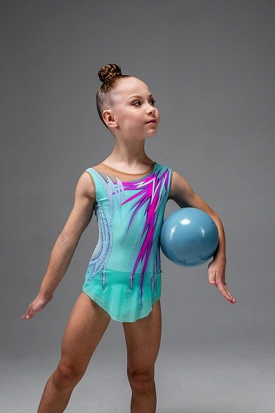 Купальник для художественной гимнастики «Ариэль» — яркий, эффектный и очень “сценичный” вариант, который сразу цепляет взгляд на ковре. Основа выполнена из качественного бифлекса в нежном бирюзовом оттенке и дополнена итальянской телесной сеткой, создающей аккуратный, «второй кожей» силуэт. Декор построен на динамичных линиях: настрочки из розового бифлекса с художественной росписью аэрографом добавляют глубину цвета и ощущение движения. Дополняют дизайн сияющие настрочки из голограммы, которые красиво ловят свет при каждом повороте и прыжке.