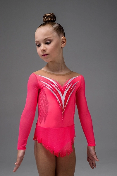 Купальник для художественной гимнастики «Дюна» выполнен из бифлекса в насыщенном неоновом розовом оттенке, который очень контрастно смотрится на ковре. Верх и спинка оформлены телесной сеткой, за счёт чего линия плеч и вырез выглядят легче и аккуратнее. Главный акцент дизайна — графичные настрочки из серебряной голограммы на бифлексе: они дают яркие переливы и визуально вытягивают силуэт. Дополнительные фактурные элементы по бокам поддерживают тему “песчаных” линий и добавляют композиции глубины.