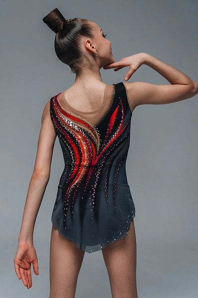 Выразительный и динамичный купальник «Иллюзион» создан для программ с сильной энергетикой и яркой подачей. Контрастное сочетание глубокого чёрного фона с огненными красно-оранжевыми и золотистыми акцентами формирует эффект движения и оптической иллюзии, визуально моделируя силуэт и подчеркивая пластику гимнастки.