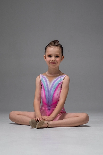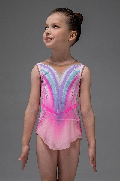 Купальник для художественной гимнастики «Лаурэль» — нежный и воздушный образ в розовой гамме с мягким переходом оттенков. Основа выполнена из бифлекса, а верхняя часть дополнена телесной сеткой, которая аккуратно оформляет линию плеч и создаёт лёгкий эффект «второй кожи». Дизайн построен на плавных дугах: по переду и спинке идут выразительные линии лавандового, голубого и розового оттенков, визуально вытягивая силуэт. Контуры и настрочки подчёркивают талию и делают посадку более графичной и собранной.