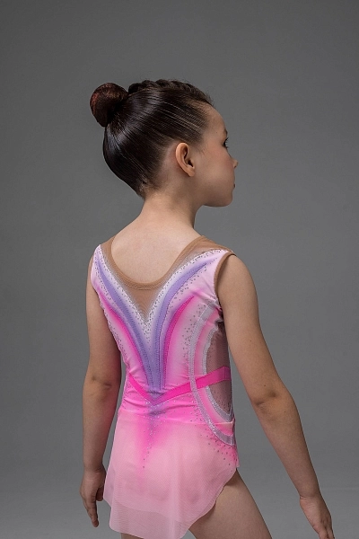 Купальник для художественной гимнастики «Лаурэль» — нежный и воздушный образ в розовой гамме с мягким переходом оттенков. Основа выполнена из бифлекса, а верхняя часть дополнена телесной сеткой, которая аккуратно оформляет линию плеч и создаёт лёгкий эффект «второй кожи». Дизайн построен на плавных дугах: по переду и спинке идут выразительные линии лавандового, голубого и розового оттенков, визуально вытягивая силуэт. Контуры и настрочки подчёркивают талию и делают посадку более графичной и собранной.