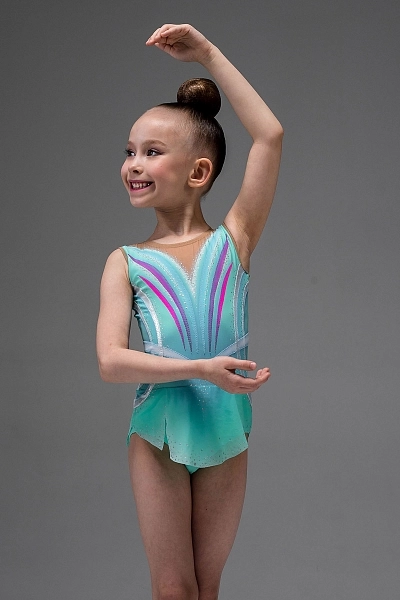 Купальник для художественной гимнастики «Мулан» выполнен в свежем бирюзовом оттенке и смотрится очень лёгким и динамичным. Основа сшита из эластичного бифлекса, а верхняя часть оформлена итальянской телесной сеткой, которая аккуратно подчёркивает линию плеч и выреза. Декор построен на стремительных линиях: на груди и спинке идут яркие акценты розового и фиолетового цвета, визуально вытягивая силуэт. Контрастные дуги по бокам красиво формируют талию и добавляют образу спортивную «собранность».