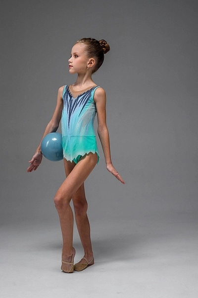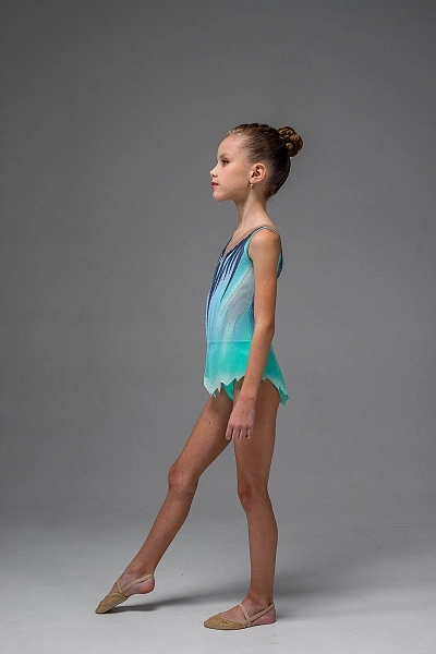 Купальник для художественной гимнастики «Покахонтас» выполнен в свежей бирюзовой гамме с плавными переходами, которые красиво смотрятся в движении. Основа из эластичного бифлекса дополнена верхом из итальянской телесной сетки, благодаря чему линия декольте и спинки выглядит лёгкой и аккуратной. Главный акцент — выразительные графичные линии тёмно-синего цвета, которые «стекают» от плеч к центру и визуально вытягивают корпус. Светлые вставки и мягкие переходы оттенков добавляют глубину и подчёркивают талию, делая силуэт более собранным.