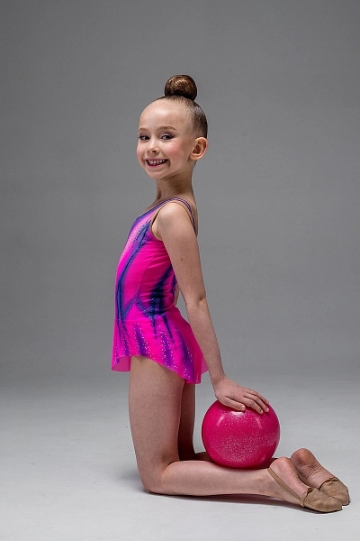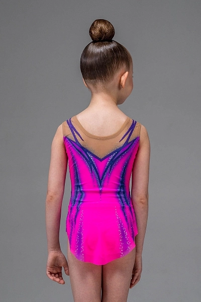 Купальник для художественной гимнастики «Жасмин» выполнен в ярком розовом цвете и сразу выделяется на ковре. Верх оформлен телесной сеткой с аккуратной окантовкой, за счёт чего линия плеч и декольте выглядит лёгкой и изящной. Дизайн построен на контрастной графике: по розовой основе идут выразительные линии фиолетового оттенка, которые визуально вытягивают силуэт. Центральные V-акценты красиво подчёркивают грудь и спинку, создавая эффект движения даже в статике.
