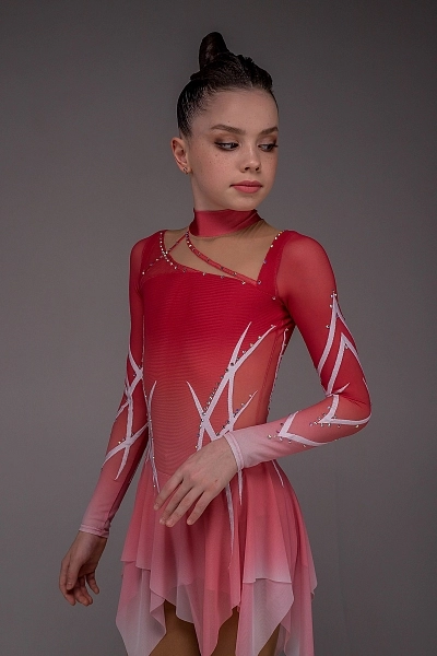 Платье для фигурного катания «Эмили» — это воплощение силы, чистоты и движения. Нежный градиент от белого к насыщенному красному плавно переходит от подола и кистей к области груди, создавая эффект пламени, поднимающегося вверх. Такое сочетание символизирует энергию, страсть и лёгкость, объединённые в едином образе. Корпус и рукава украшены белыми настрочками из бифлекса, формирующими изящные геометрические узоры, которые придают костюму динамичность и современное звучание.
