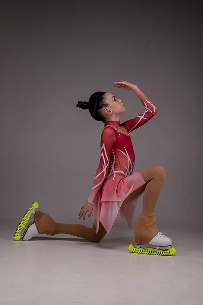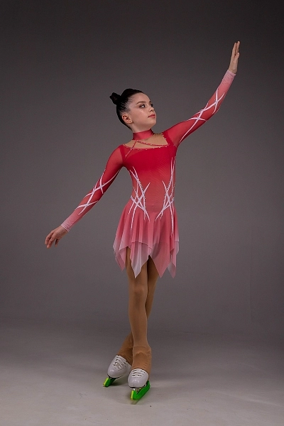 На спине платье выглядит не менее выразительно — вставка из итальянской телесной сетки имитирует открытый вырез, добавляя изысканности и воздушности. Образ дополняют стойка и застёжка-«капелька», подчёркивающие элегантность шеи и завершённость силуэта. Завершает композицию двойная асимметричная юбка из лёгкой сетки, мягко колышущаяся при каждом движении и подчёркивающая пластичность фигуристки. Платье «Эмили» создано для программ, наполненных эмоцией, внутренней силой и артистизмом, где каждый элемент костюма становится частью выразительного танца на льду.