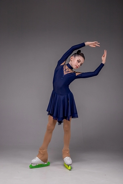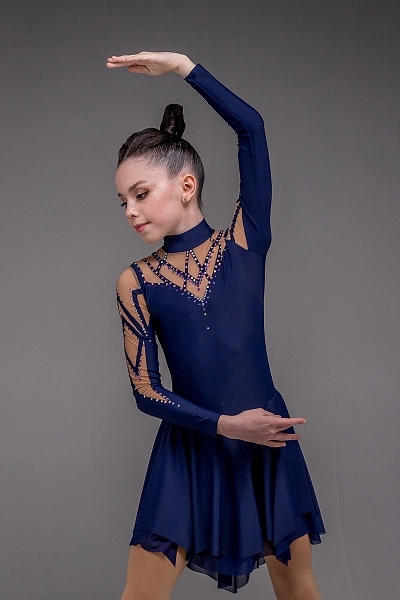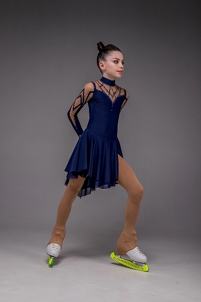Платье для фигурного катания «Эстелла» — это воплощение утончённой силы и безупречного стиля. Основной синий цвет придаёт образу глубину и благородство, создавая ощущение уверенности и гармонии. Корпус выполнен из гладкого синего бифлекса, который идеально подчёркивает линии фигуры и обеспечивает свободу движения. Рукава, зона груди и спины оформлены итальянской телесной сеткой, украшенной настрочками из синего бифлекса, создающими изящные геометрические узоры. Эти детали придают костюму изысканность и визуальную динамику, словно отражая игру света на льду.