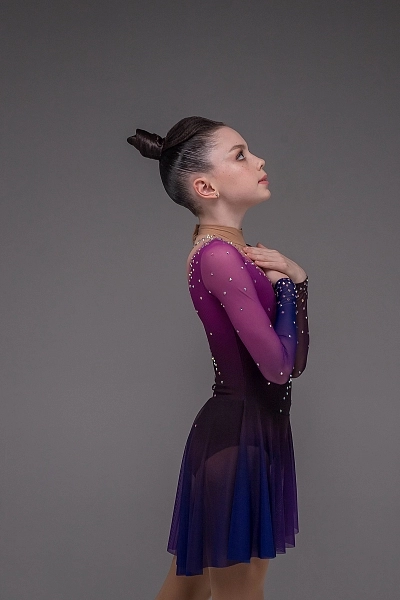Платье для фигурного катания «Мадина» — это гармоничное сочетание глубины цвета и выразительного дизайна. Основу костюма составляет сублимационная сетка, переливающаяся оттенками от розового до насыщенного фиолетового, с преобладанием тёмных и глубоких тонов. Такой градиент создаёт ощущение движения и энергии, подчеркивая выразительность программы и каждое движение фигуристки. В области груди и спины использована телесная итальянская сетка, создающая эффект изящных вырезов и лёгкости. Стойка-воротник и застёжка-«капелька» на спине добавляют утончённости и делают силуэт завершённым и элегантным.