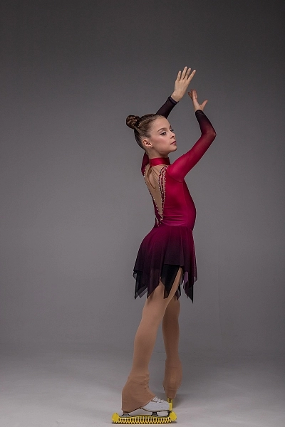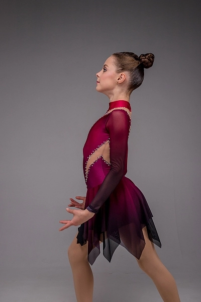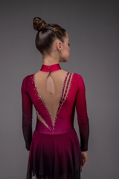 Рукава из бордовой сублимационной сетки плавно переходят в общий тон платья, усиливая глубину цвета и создавая цельный, насыщенный образ. Стойка-воротник со застёжкой-«капелькой» на спине добавляет изысканности и утончённости. Завершает композицию двойная асимметричная юбка, мягко струящаяся при каждом движении, словно языки огня, оживающие на льду. Платье «Мартина» создано для программ, наполненных эмоцией, внутренней силой и артистизмом, где каждый жест становится отражением темперамента фигуристки.