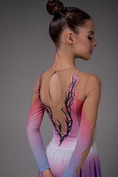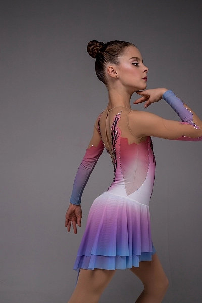 Платье для фигурного катания «Меган» — это поэтичное воплощение лёгкости и утончённости. Нежные градиенты от белого к розовому и голубому создают ощущение рассветного неба, переливающегося мягкими оттенками. Корпус и рукава выполнены из сочетания итальянской телесной сетки и сетки в пастельных тонах, которые плавно пересекаются между собой, создавая эффект прозрачности и воздуха. Такое сочетание подчёркивает изящность движений и придаёт костюму утончённый, почти сказочный характер.