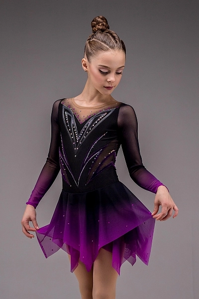 Рукава и двойная асимметричная юбка выполнены из чёрной сетки с сублимационным переходом в сиреневый оттенок, благодаря чему костюм выглядит живым и многослойным. Юбка мягко струится при вращениях, отражая свет и добавляя лёгкости всему образу. Платье «Николь» идеально подходит для программ, наполненных глубокой эмоцией, грацией и силой, подчёркивая загадочность и уверенность фигуристки на льду.