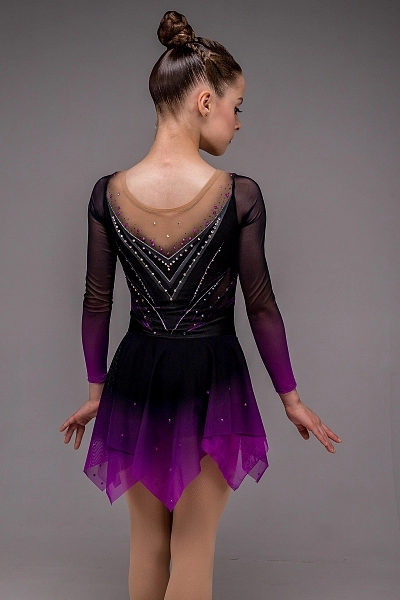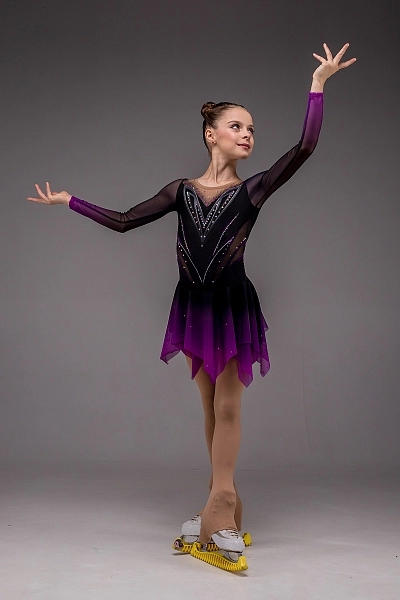 Рукава и двойная асимметричная юбка выполнены из чёрной сетки с сублимационным переходом в сиреневый оттенок, благодаря чему костюм выглядит живым и многослойным. Юбка мягко струится при вращениях, отражая свет и добавляя лёгкости всему образу. Платье «Николь» идеально подходит для программ, наполненных глубокой эмоцией, грацией и силой, подчёркивая загадочность и уверенность фигуристки на льду.
