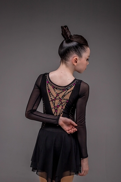 Со спины платье выглядит не менее эффектно — телесная сетка украшена чёрными настрочками, повторяющими мотив передней части, но в более сдержанном и графичном исполнении. Игра контрастов и тонких линий создаёт ощущение движения и точности. Платье «Софи» идеально подходит для программ, где важны уверенность, выразительность и стиль, подчёркивая внутреннюю силу и артистизм фигуристки.