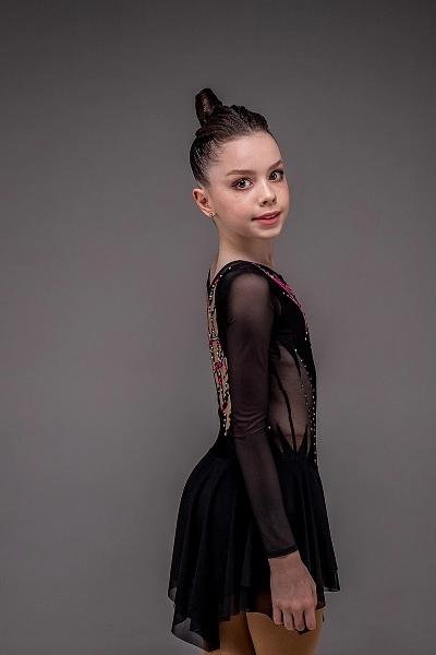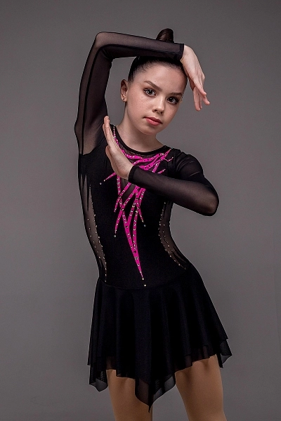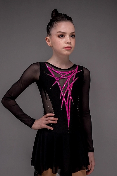 Платье для фигурного катания «Софи» — это образ силы и элегантной строгости, воплощённый в насыщенном чёрном цвете. Рукава и боковые части корпуса выполнены из чёрной сетки, создающей лёгкий визуальный контраст и придающей силуэту выразительность. Такое решение мягко подчёркивает талию и делает фигуру более утончённой. Спереди внимание привлекают настрочки из розового бифлекса, образующие изящный геометрический узор, который добавляет динамики и современного характера образу.