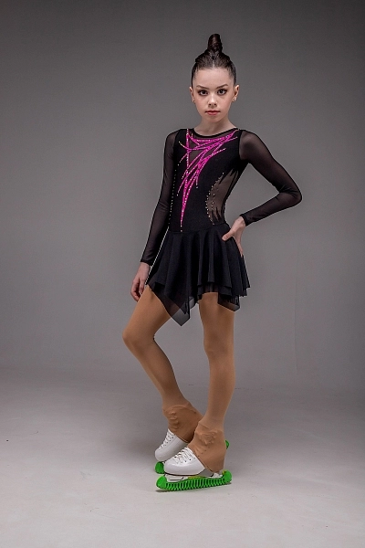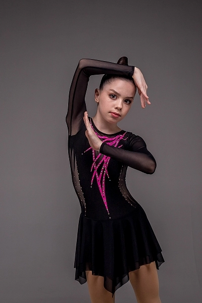Платье для фигурного катания «Софи» — это образ силы и элегантной строгости, воплощённый в насыщенном чёрном цвете. Рукава и боковые части корпуса выполнены из чёрной сетки, создающей лёгкий визуальный контраст и придающей силуэту выразительность. Такое решение мягко подчёркивает талию и делает фигуру более утончённой. Спереди внимание привлекают настрочки из розового бифлекса, образующие изящный геометрический узор, который добавляет динамики и современного характера образу.