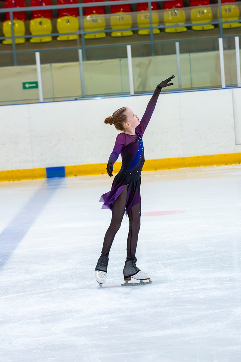 Платье «Танец теней», как хореография света и мрака, создаёт образ, в котором каждая тень говорит. Глубокие градиенты от чёрного к темно-сиреневому окутывают фигуру, словно туманные силуэты, танцующие на границе дня и ночи. Яркая синяя полоса, пробегающая по груди и спине, будто внезапная вспышка в темноте, придаёт образу драматичную напряжённость. Сетка поверх бифлекса делает фактуру сложной и многослойной. Полные рукава из сетки усиливают ощущение полёта, а двойная асимметричная юбка с градиентом реагирует на каждое движение тела, как живая. В этом платье — не просто эстетика, а повествование. Оно создано для программ, где каждое движение — эмоция, а каждый поворот — тайна. «Танец теней» не требует слов — он сам становится историей.