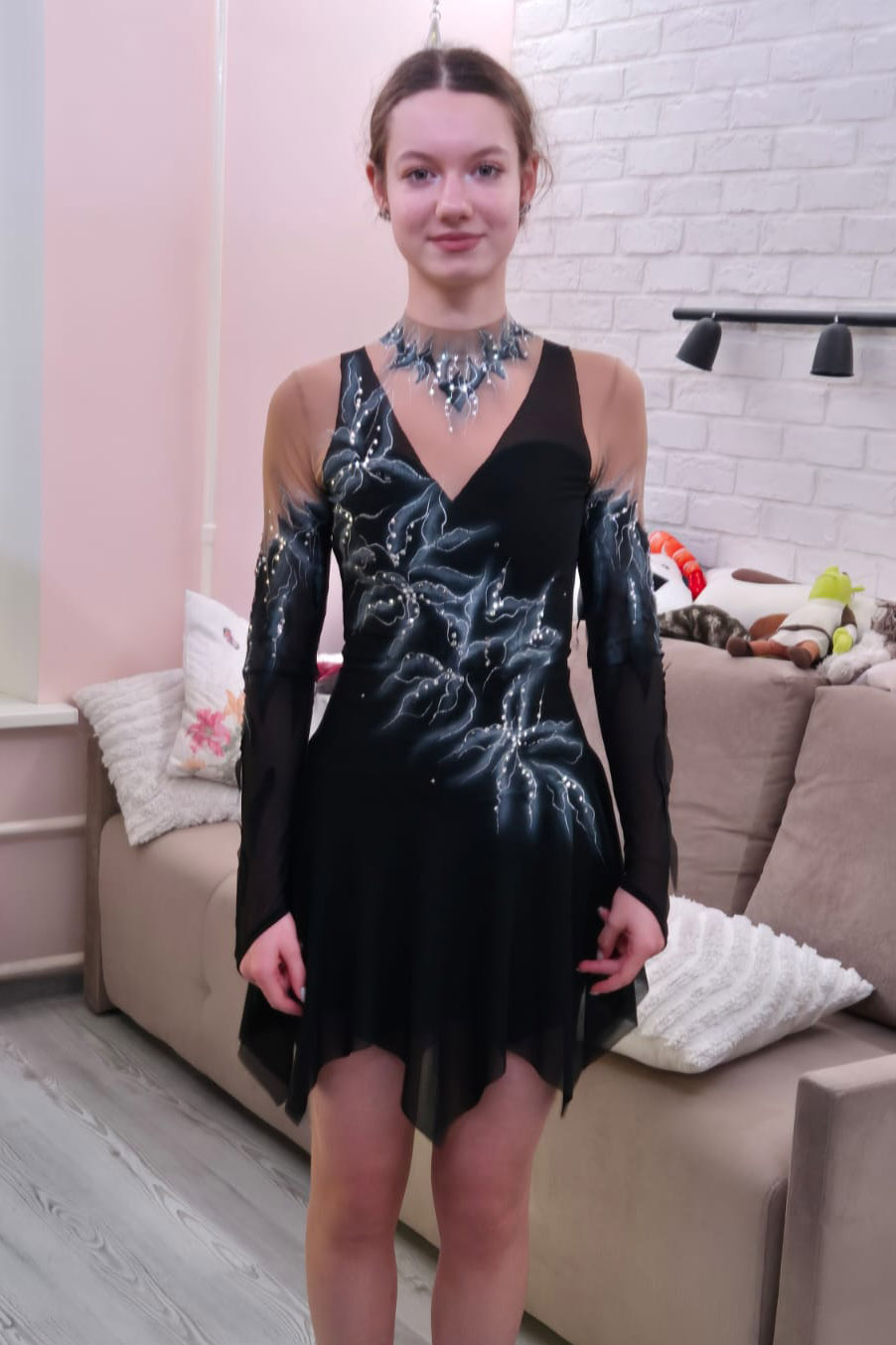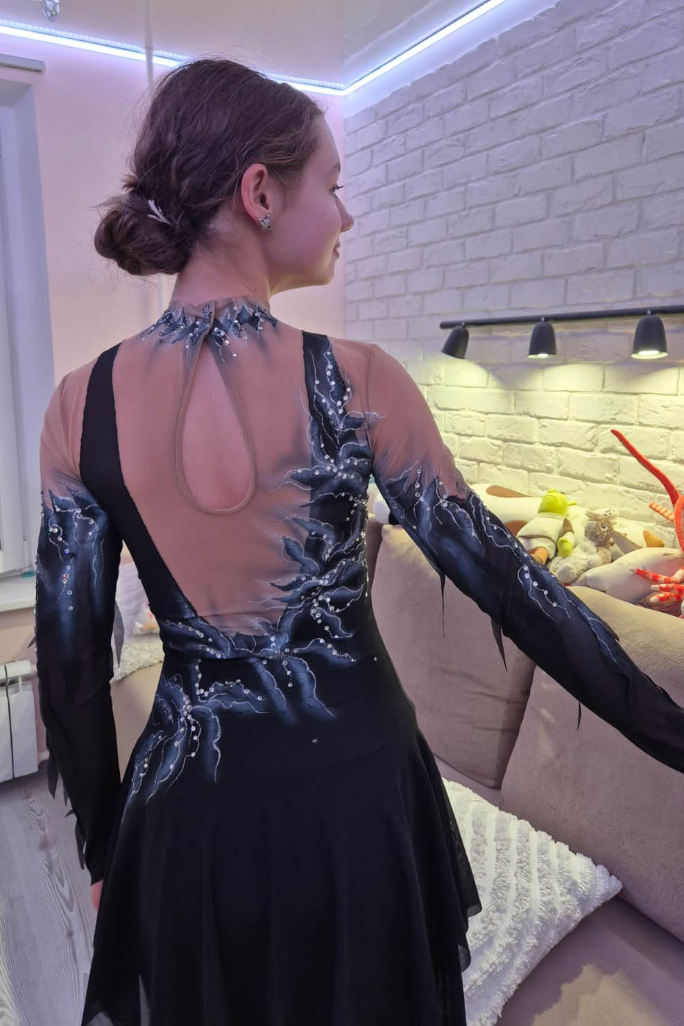 Платье для фигурного катания "Цветочная соната Black" — это сочетание загадочности, элегантности и современного дизайна. Основной цвет платья — глубокий черный, который олицетворяет таинственность и изысканность, подчеркивая грацию и уверенность фигуристки на льду.