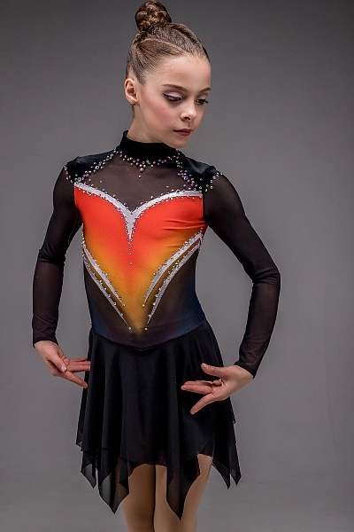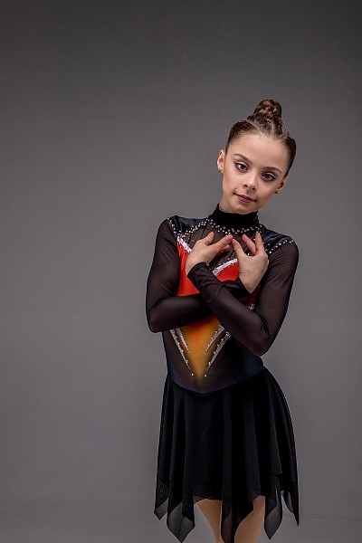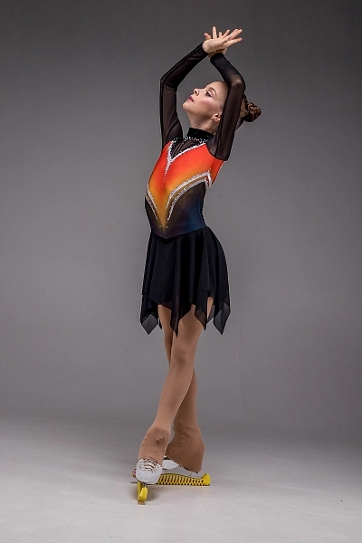 Рукава, зона груди и спины выполнены из чёрной сетки, что придаёт образу лёгкость и изящество, сохраняя при этом силу и выразительность линий. Плечи и стойка-воротник из бархата добавляют благородства и мягкого блеска, а застёжка-«капелька» на шее завершает изысканный силуэт. Образ дополняет чёрная асимметричная двойная юбка, которая красиво движется в танце, подчёркивая ритм и пластику фигуристки. Платье «Юнона» создано для программ, где важно сочетание эмоции, мощи и артистического огня, отражая внутреннюю энергию спортсменки.