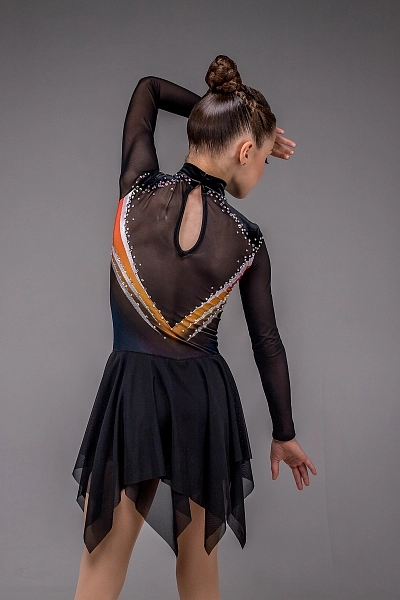 Платье для фигурного катания «Юнона» — это эффектное сочетание силы, контраста и блеска. Основной чёрный цвет придаёт костюму глубину и драматизм, становясь фоном для ярких акцентов. Корпус спереди украшен бифлексом, окрашенным аэрографом в переливающихся оранжево-жёлтых тонах, создающих впечатление огня, вспыхивающего на льду. Дополняют композицию настрочки из серебристого бифлекса-голограммы, которые мерцают при свете прожекторов, добавляя костюму динамики и эффектности.