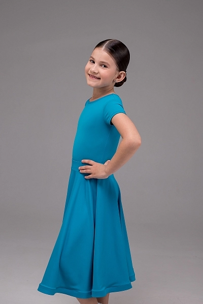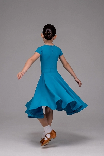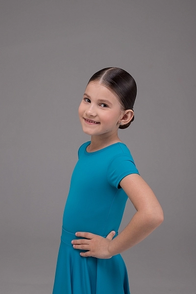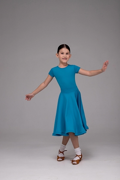 Драгоценный аквамарин в мире танца - это платье в благородном бирюзовом цвете переливается глубиной тропического моря. Бифлекс премиального состава мягко облегает фигуру, а короткий рукав добавляет образу утонченности. Широкая юбка-солнце на скрытой резинке раскрывается подобно морской глади, наполняя танец плавностью и объемом.