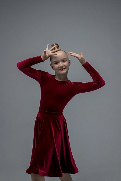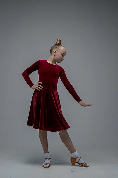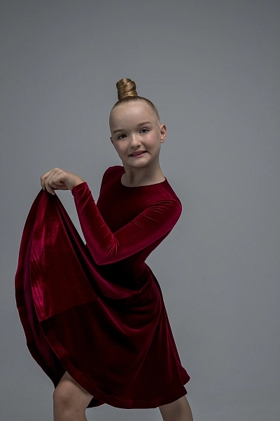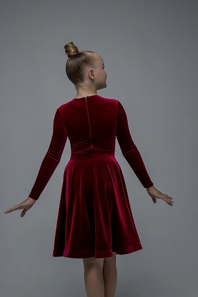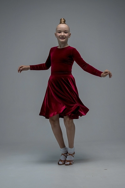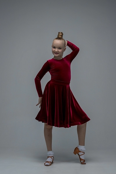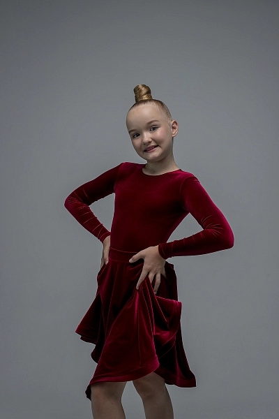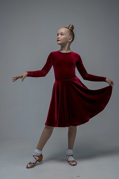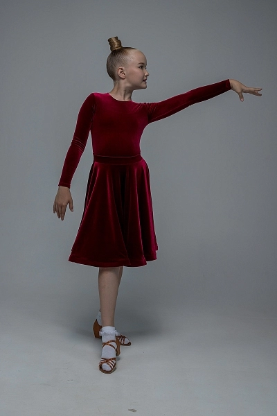 Бордовое платье Профи из двух частей — это воплощение страсти и королевского достоинства. Глубокий бархатный купальник с элегантным длинным рукавом строго облегает торс, подчеркивая силуэт, а пышная юбка-солнце на мягкой резинке создает мощный, летящий объем.