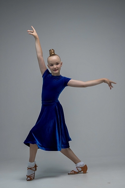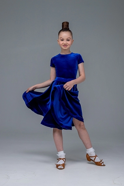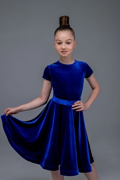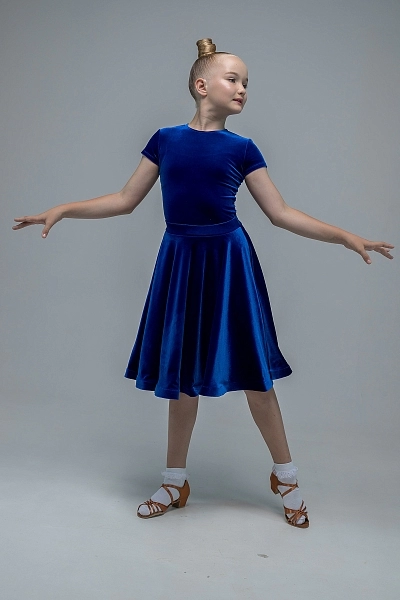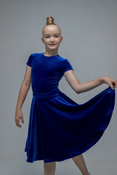 Как первый луч солнца на водной глади, это платье в благородном васильковом оттенке привносит на паркет свежесть и глубину. Комплект состоит из роскошного бархатного купальника с изящным коротким рукавом и пышной юбки на скрытой широкой резинке, обеспечивающей идеальную посадку и свободу движений.
