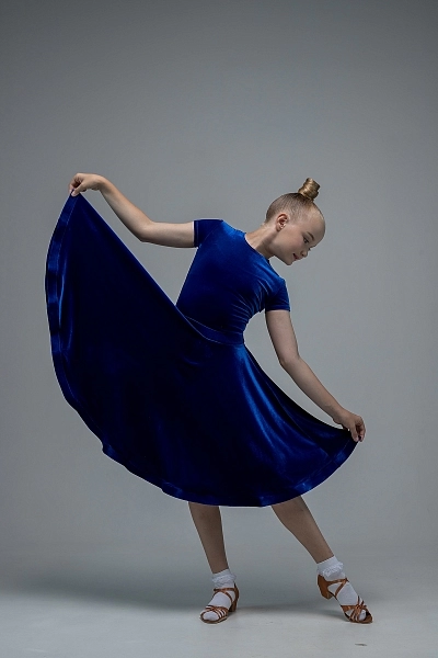 Юбка-солнце со скрытым регилином раскрывается при вращениях подобно распускающемуся цветку, наполняя танец объемом и грацией. Бархатный верх мягко облегает фигуру, а элегантный короткий рукав подчеркивает линию плеч, создавая гармоничный силуэт.