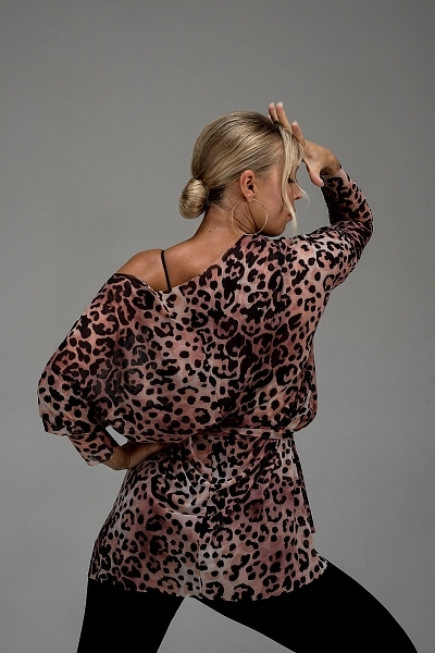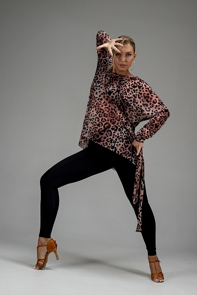 Свободный крой оверсайз и дерзкий асимметричный подол струятся в движении, создавая эффект летящего силуэта, который подчеркивает пластику и динамику танца. Сублимационный леопардовый принт, яркий и стойкий, словно отголосок дикой природы, добавляет образу харизматичности и уверенности.
